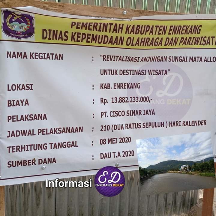 Sekedar diketahui, proyek revitalisasi anjungan DAS Mata Allo itu dilaksanakan oleh Dinas Pemuda Olahraga Kabupaten Enrekang dengan menggunakan anggaran senilai Rp13 miliar yang bersumber dari Dana Alokasi Umum (DAU) tahun anggaran 2020.
